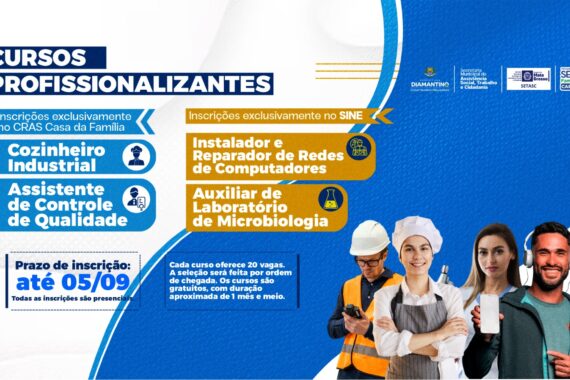 A Prefeitura de Diamantino, por meio da Secretaria Municipal de Assistência Social, Trabalho e Cidadania, em parceria com o Programa Ser Família Capacita, informa à comunidade que estão abertas as inscrições para cursos profissionalizantes gratuitos. As inscrições são presenciais e seguem até o dia 5 de setembro.